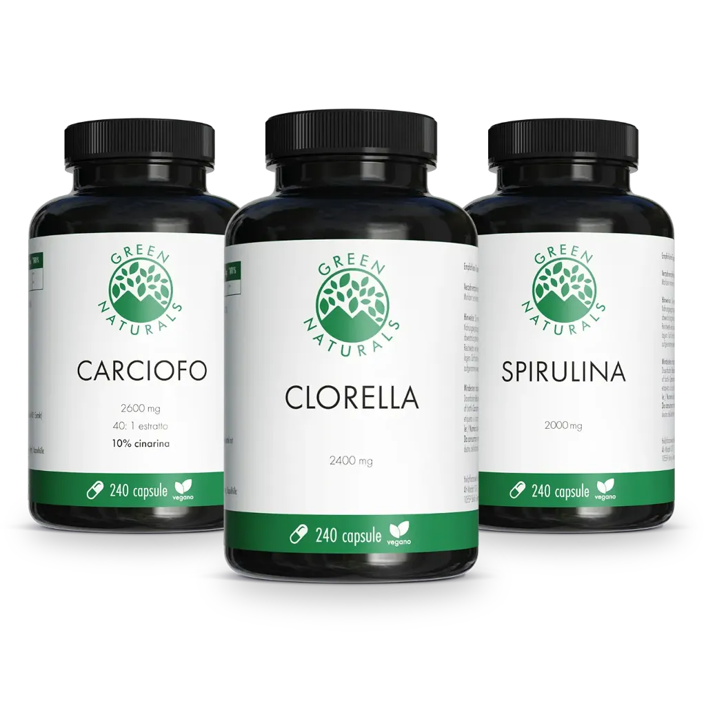 - Il trattamento consiste in 2.600 mg di estratto di carciofo altamente concentrato (in un rapporto di 40:1) con una proporzione del 10% di cinarina, 2.000 mg di spirulina e 2.400 mg di clorella al giorno.