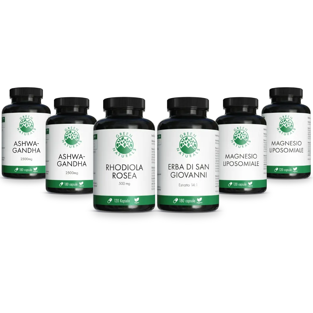 Rafforza la tua pace interiore e trova l'equilibrio: il nostro esclusivo pacchetto di Rhodiola Rosea, Ashwagandha ed erba di San Giovanni ti offre il supporto perfetto per il benessere emotivo e il magnesio supporta la normale funzione psicologica e il sistema nervoso.