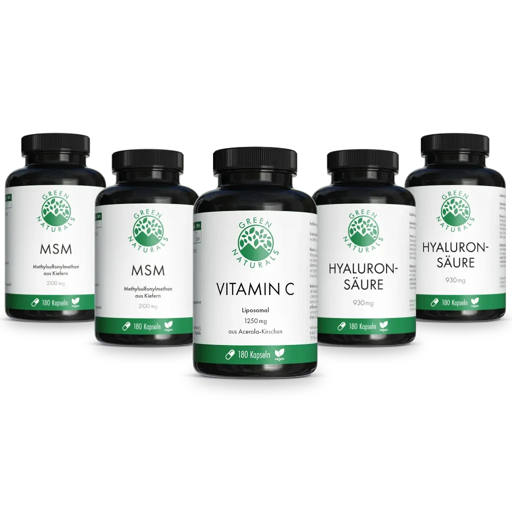 Täglich zwei Kapseln Vitamin C, drei Kapseln MSM und drei Kapseln Hyaluronsäure mit ausreichend Wasser einnehmen.
